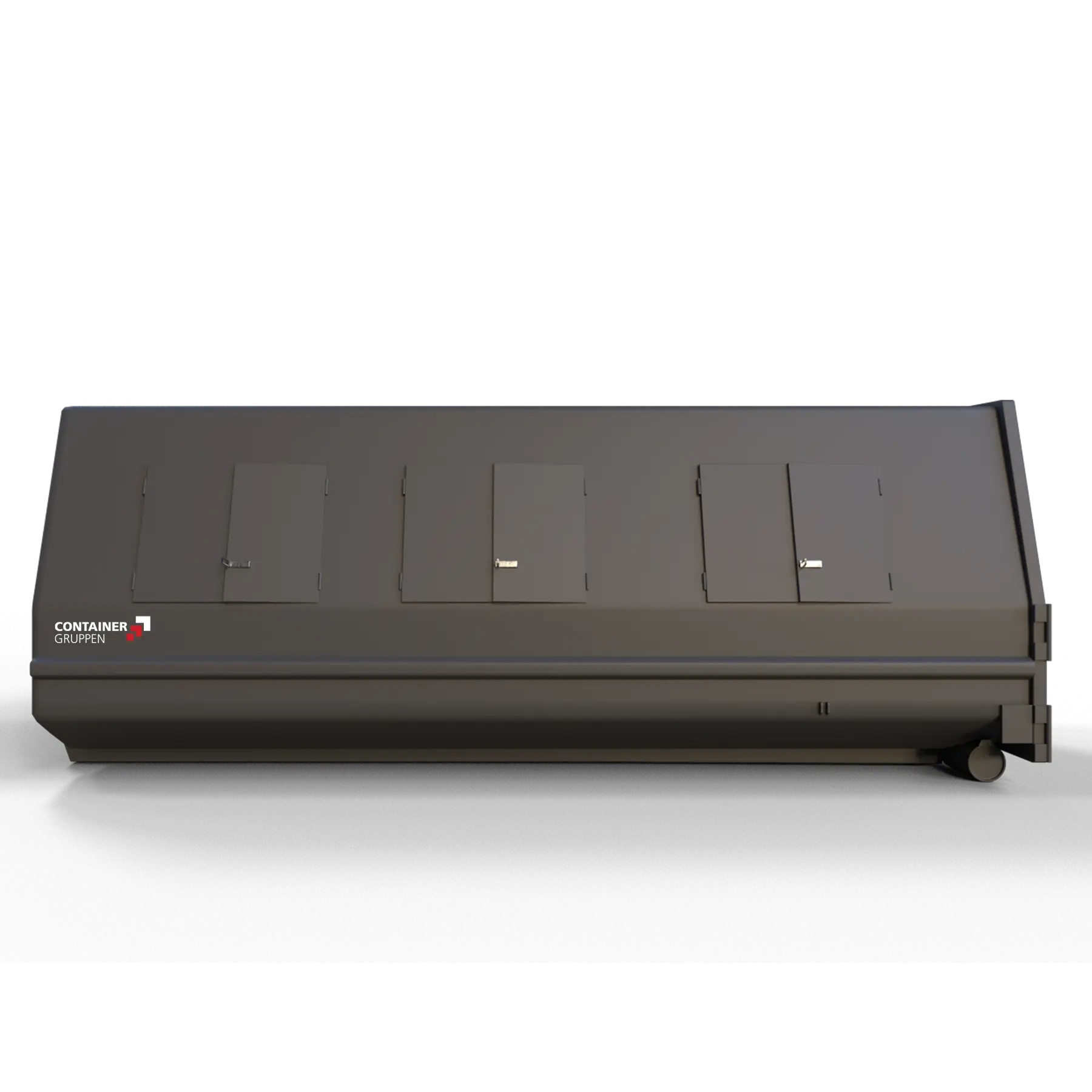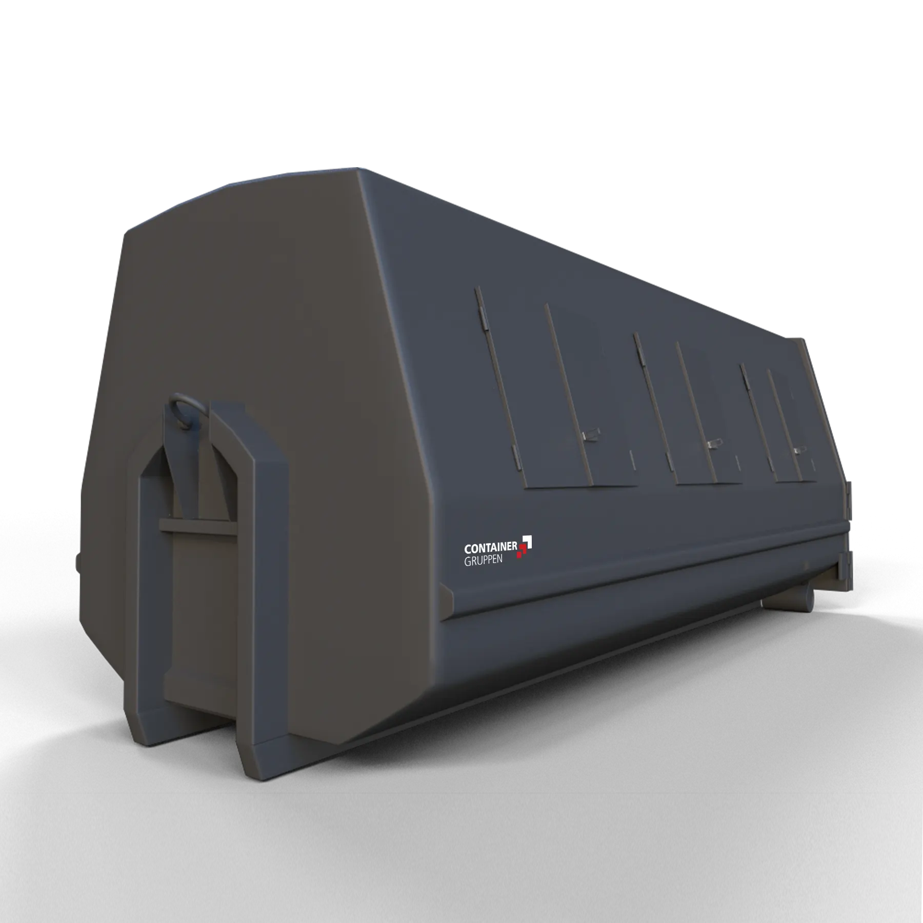 Lukket krokcontainer. Std. med stål sideluker, og sidehengslede bakdører.Kraftige hengsler med beskyttelse rundt smørenipler. Tilvalg: Plast sideluker, andre innkast og delevegger for flere fraksjoner. Vedlikeholdsfrie hjul/ruller med tette lagre, bufferklosser og forsterkning rundt låsehull. Std. størrelser er: 15-20 og 26m³. Disse 3 størrelsen kan stables i hverandre for transport i tom tilstand.